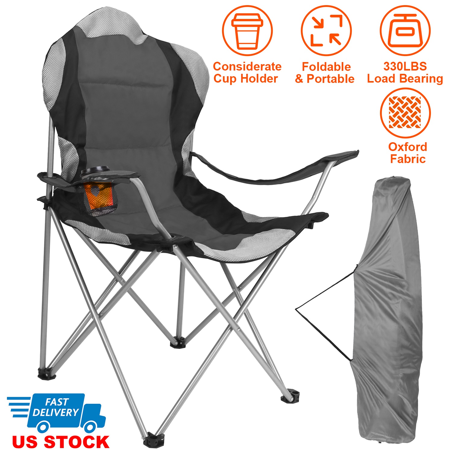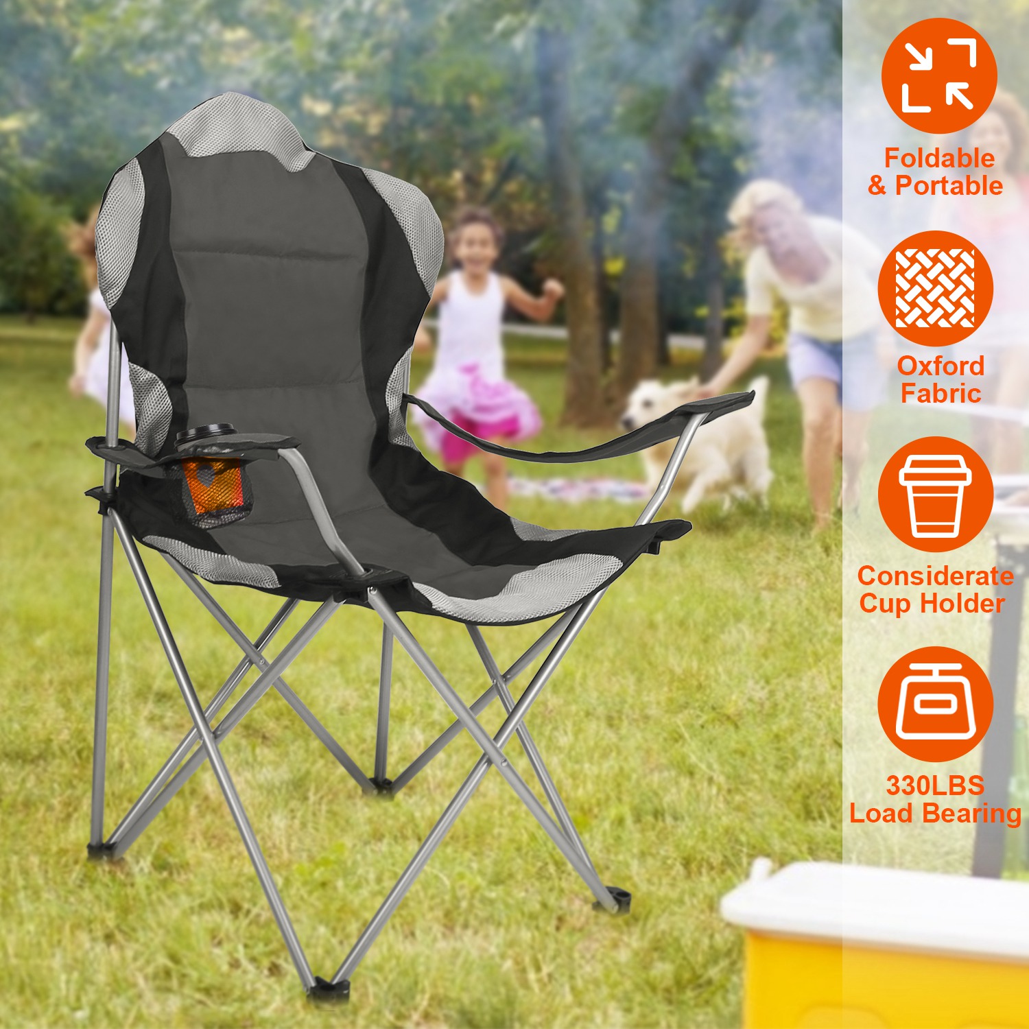 Home > Foldable Camping Chair Heavy Duty Steel Lawn Chair Padded Seat Arm Back Beach Chair 330LBS Max Load with Cup Holder Carry Bag