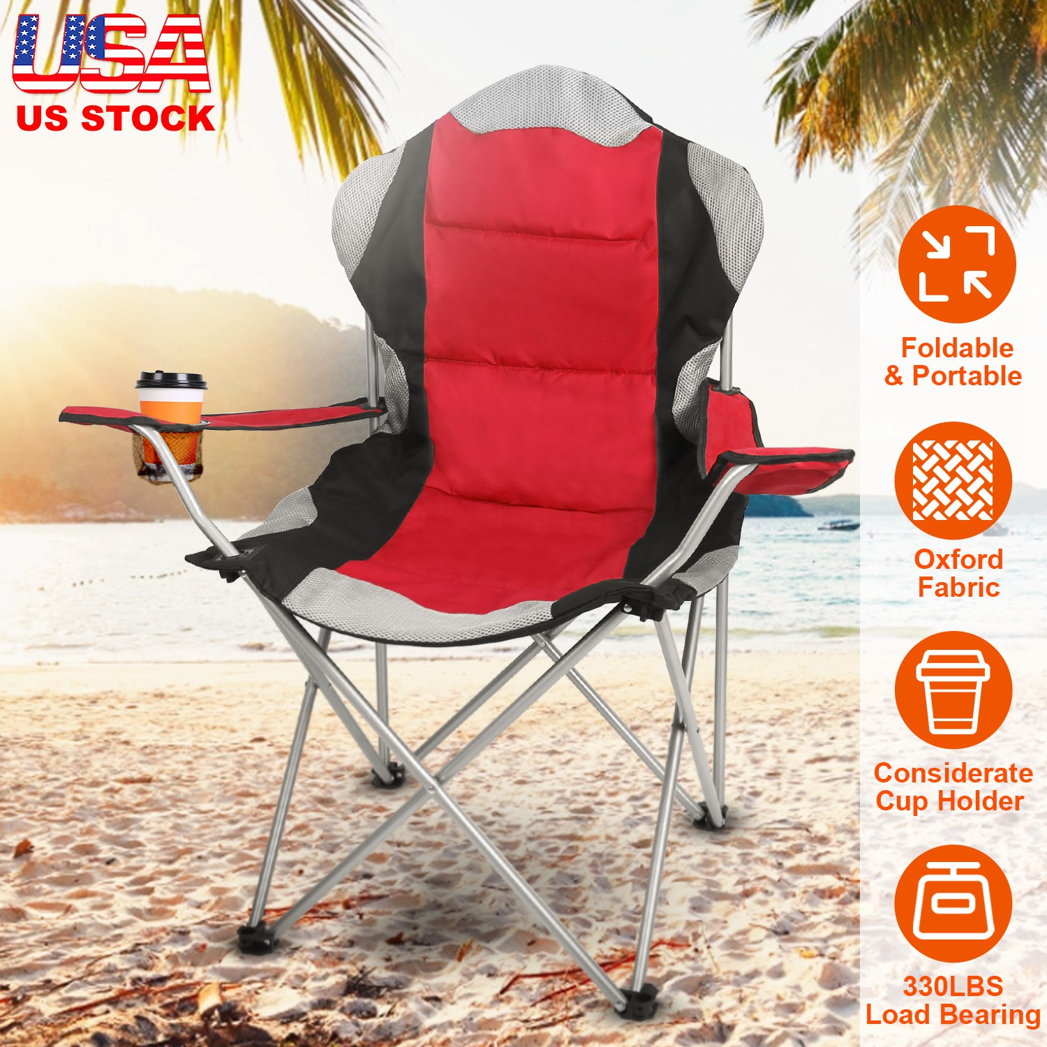 Home > Foldable Camping Chair Heavy Duty Steel Lawn Chair Padded Seat Arm Back Beach Chair 330LBS Max Load with Cup Holder Carry Bag