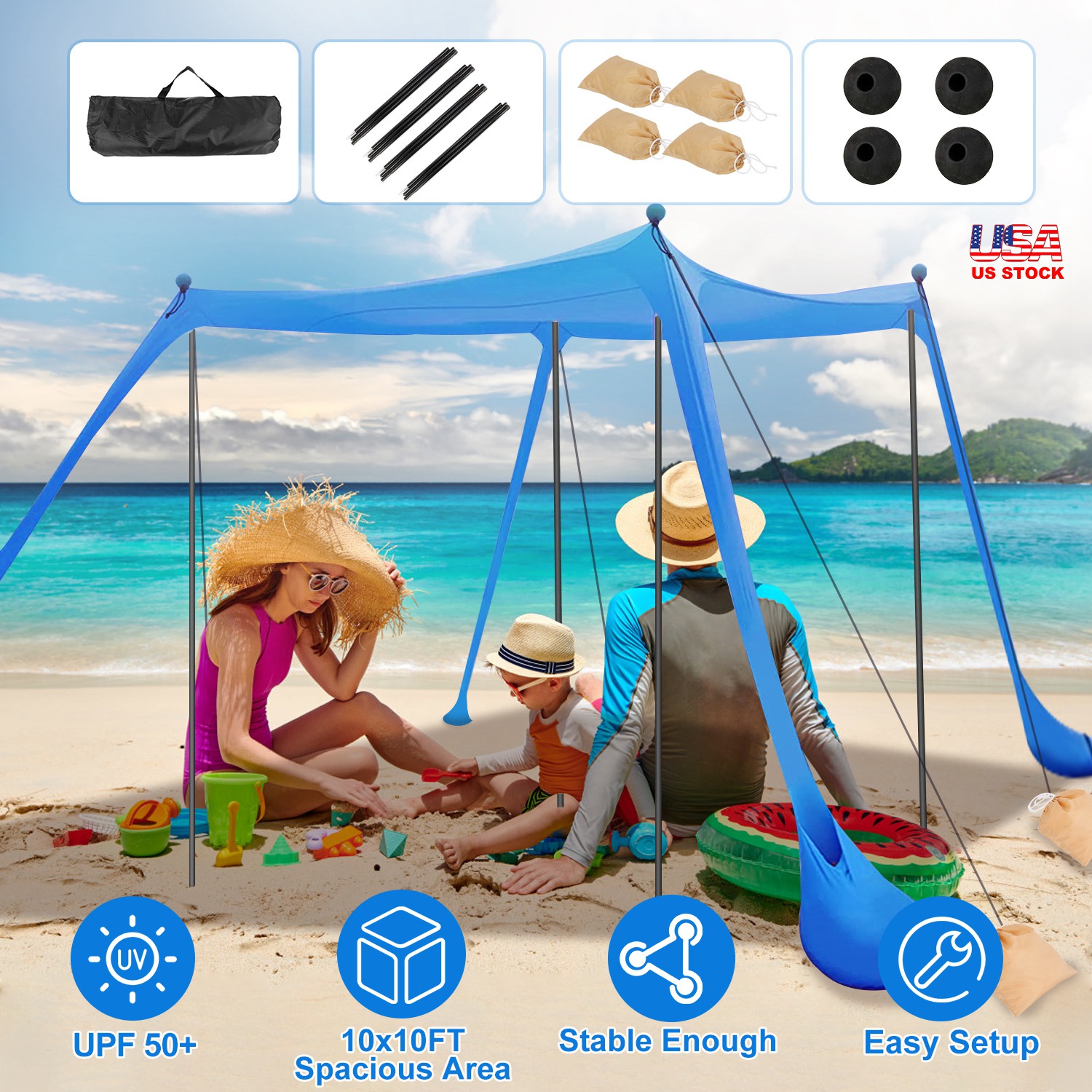 Beach Canopy Tent 10x10ft Sun Shelter Family Beach Tent Outdoor Shade UPF50+ with Sandbag Foldable Poles Carry Bag for Camping Trip Fishing Picnic