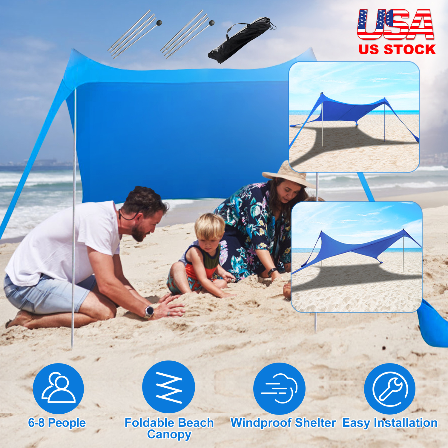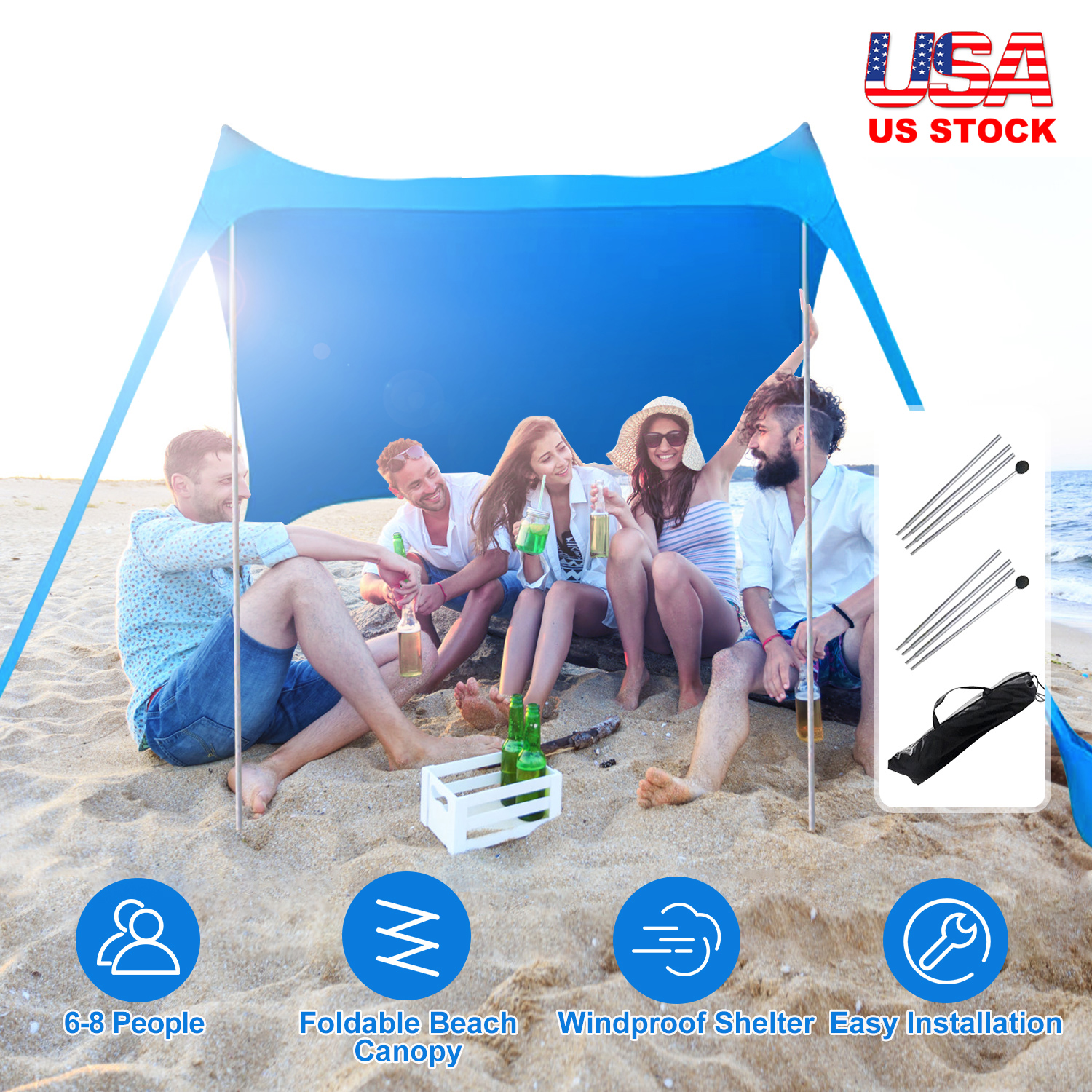 9.8x9.8FT Foldable Beach Canopy Tent Collapsible Shade Sail Sun Protection Windproof Shelter 4 Sandbag 2 Pole Portable Storage Bag Rectangle Blue
